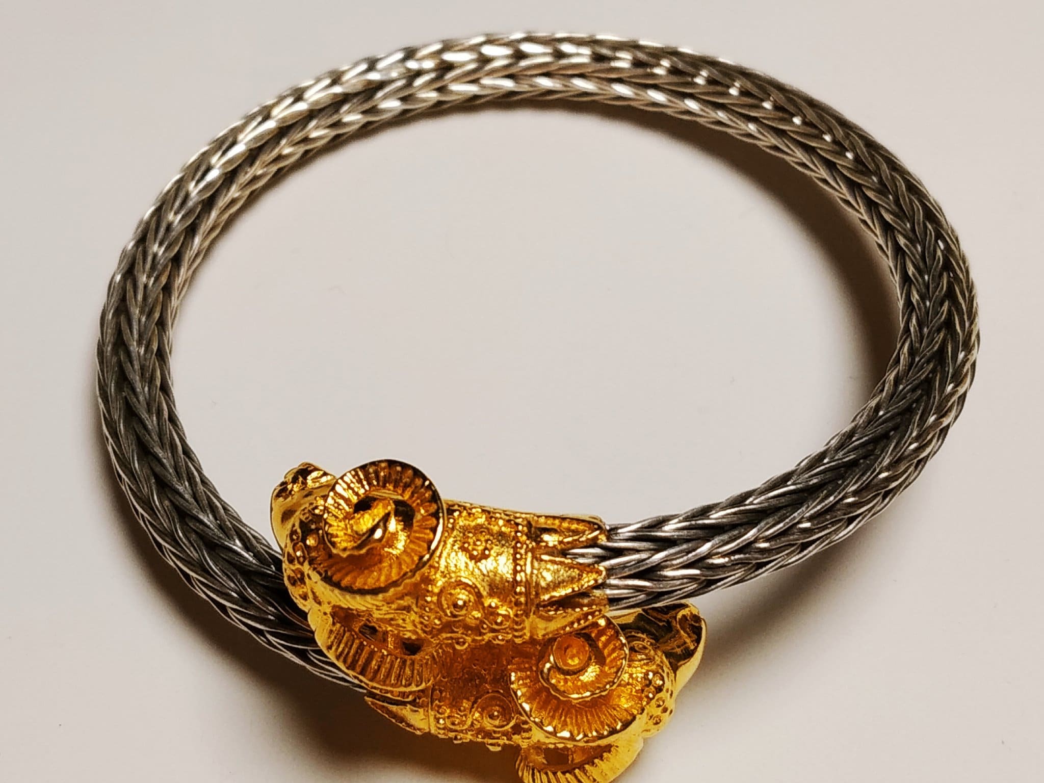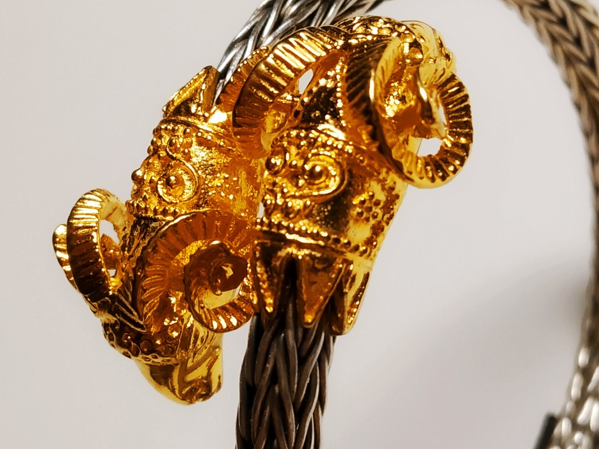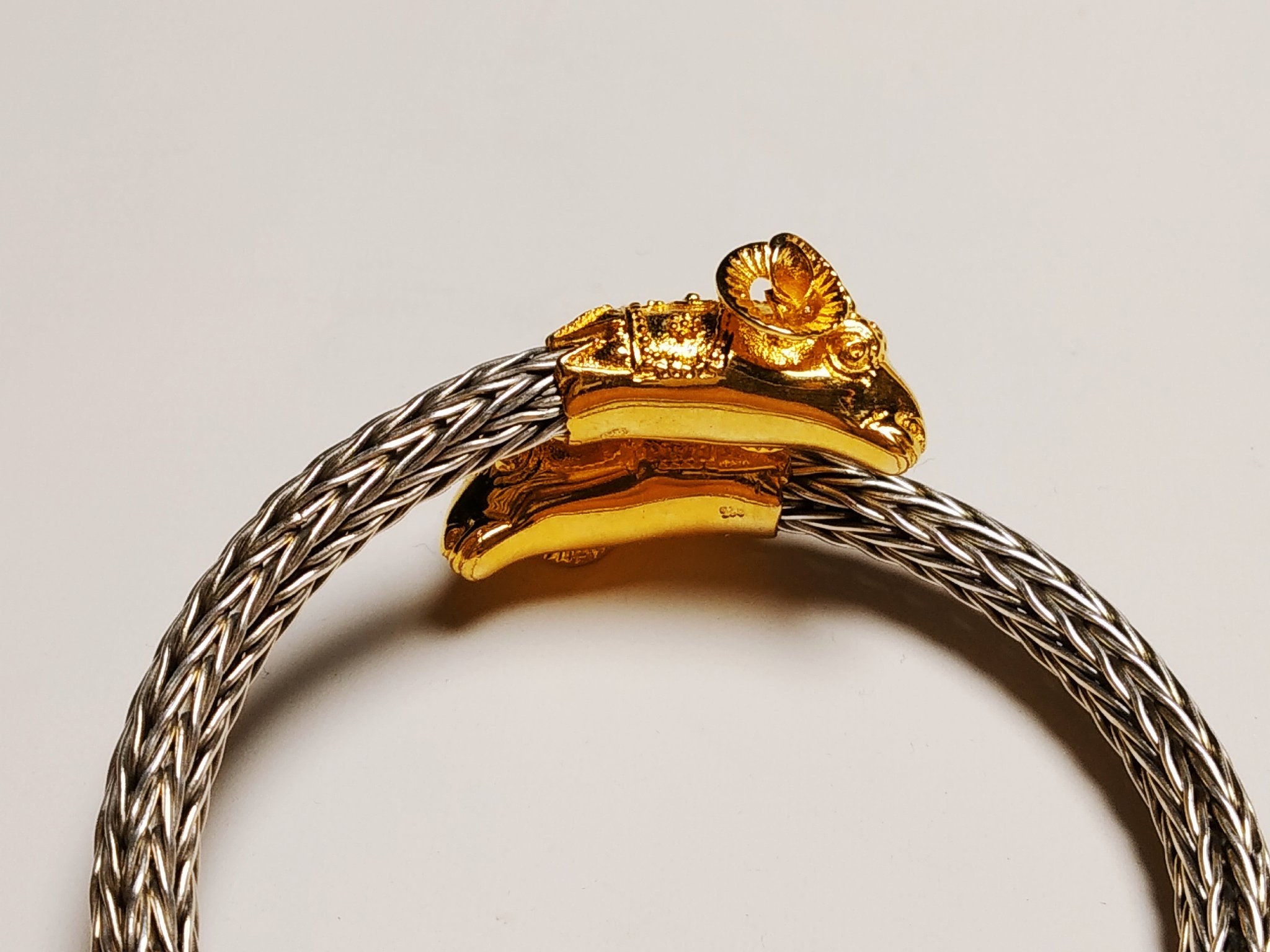 Ancient Greek hand knitted sterling silver and gold plated bracelet with ram heads.
