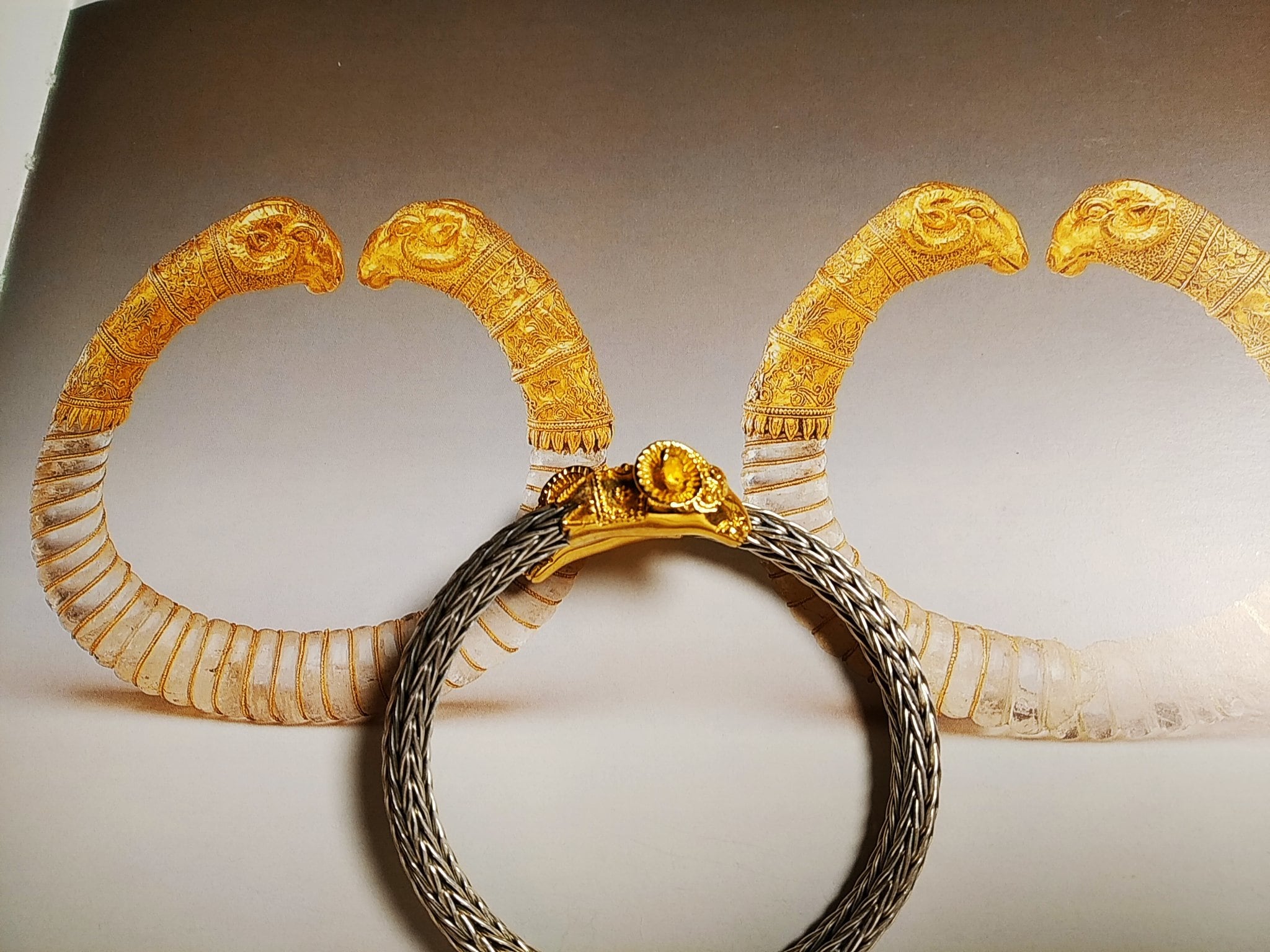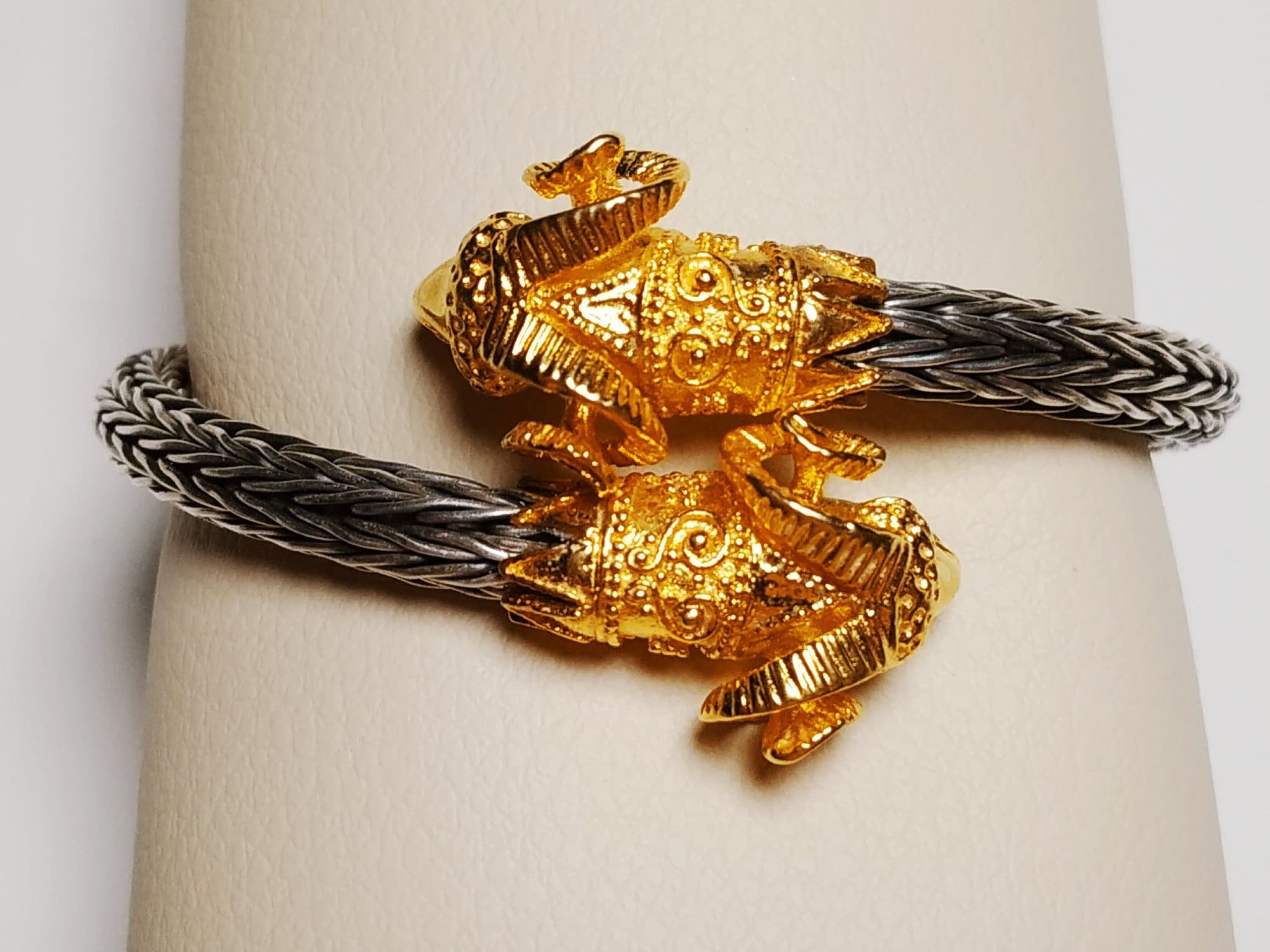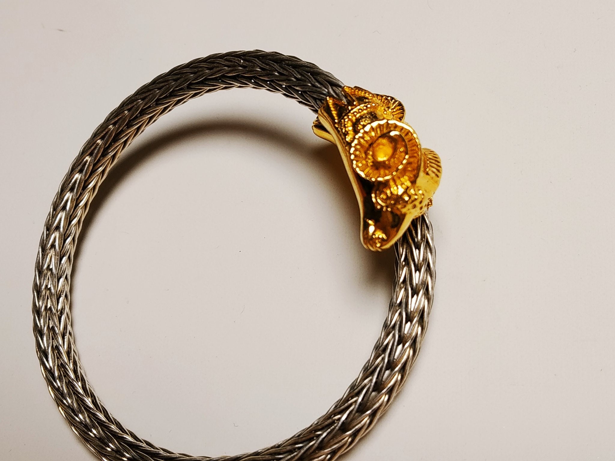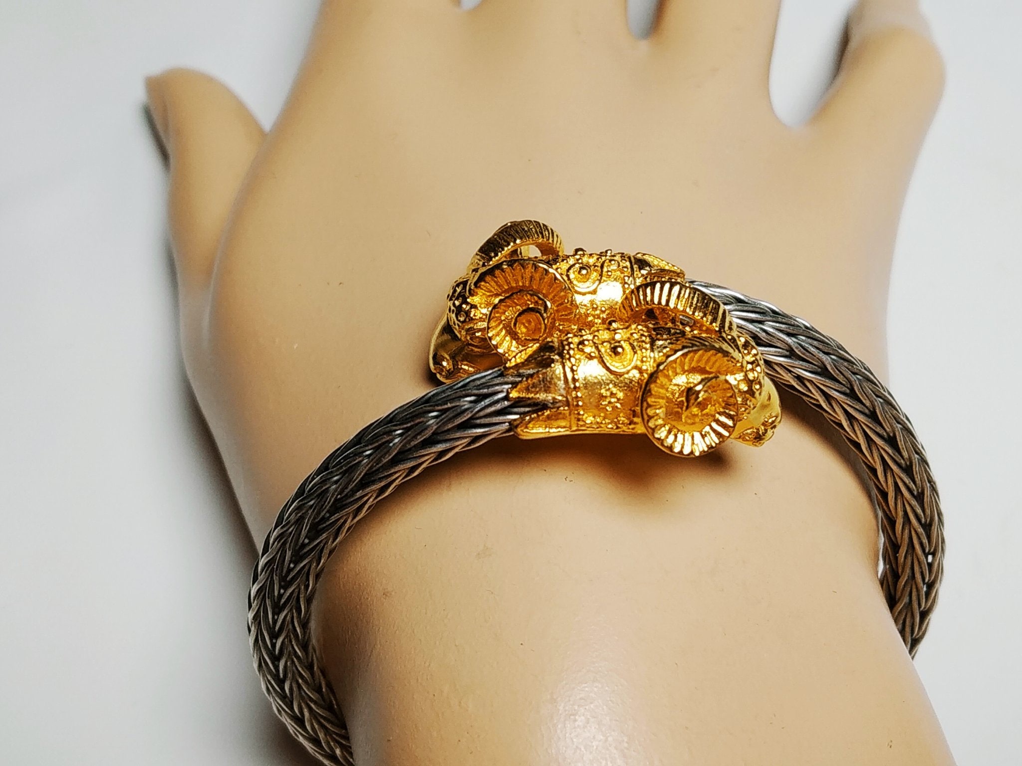 Ancient Greek hand knitted sterling silver and gold plated bracelet with ram heads.