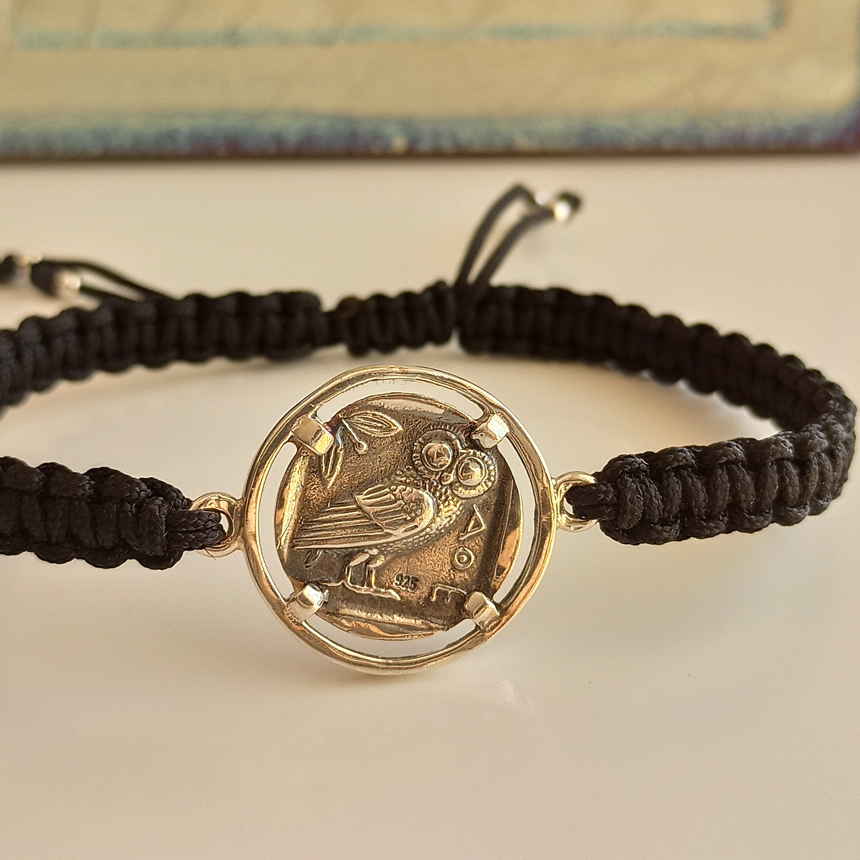 Macrame knitted bracelet with Athenian Tetradrachm coin of Goddess Athena in sterling silver 925