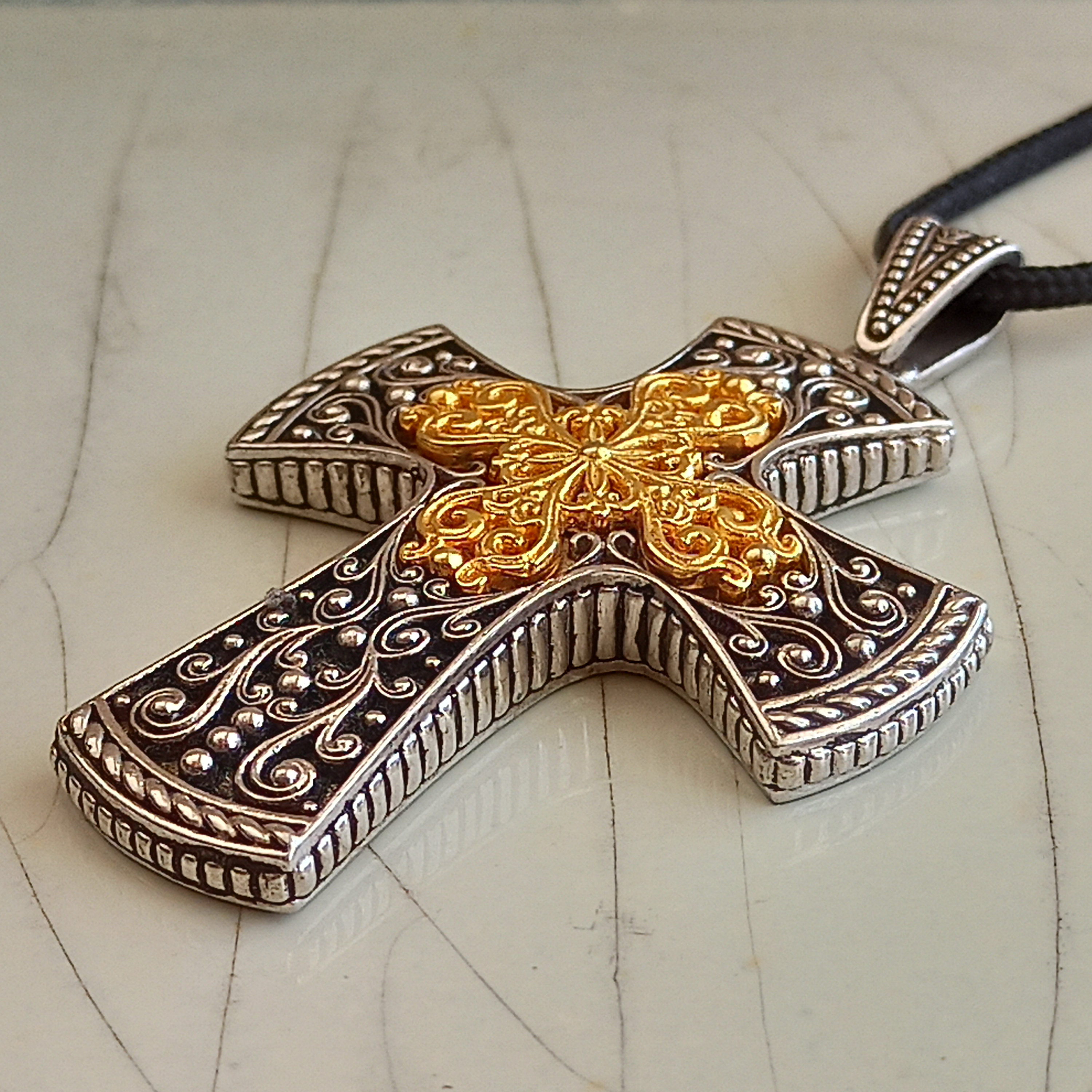 Byzantine Greek style Cross made of platinum plated and oxidized sterling silver 925